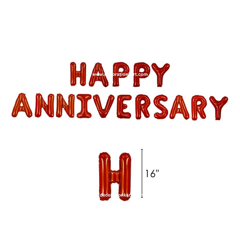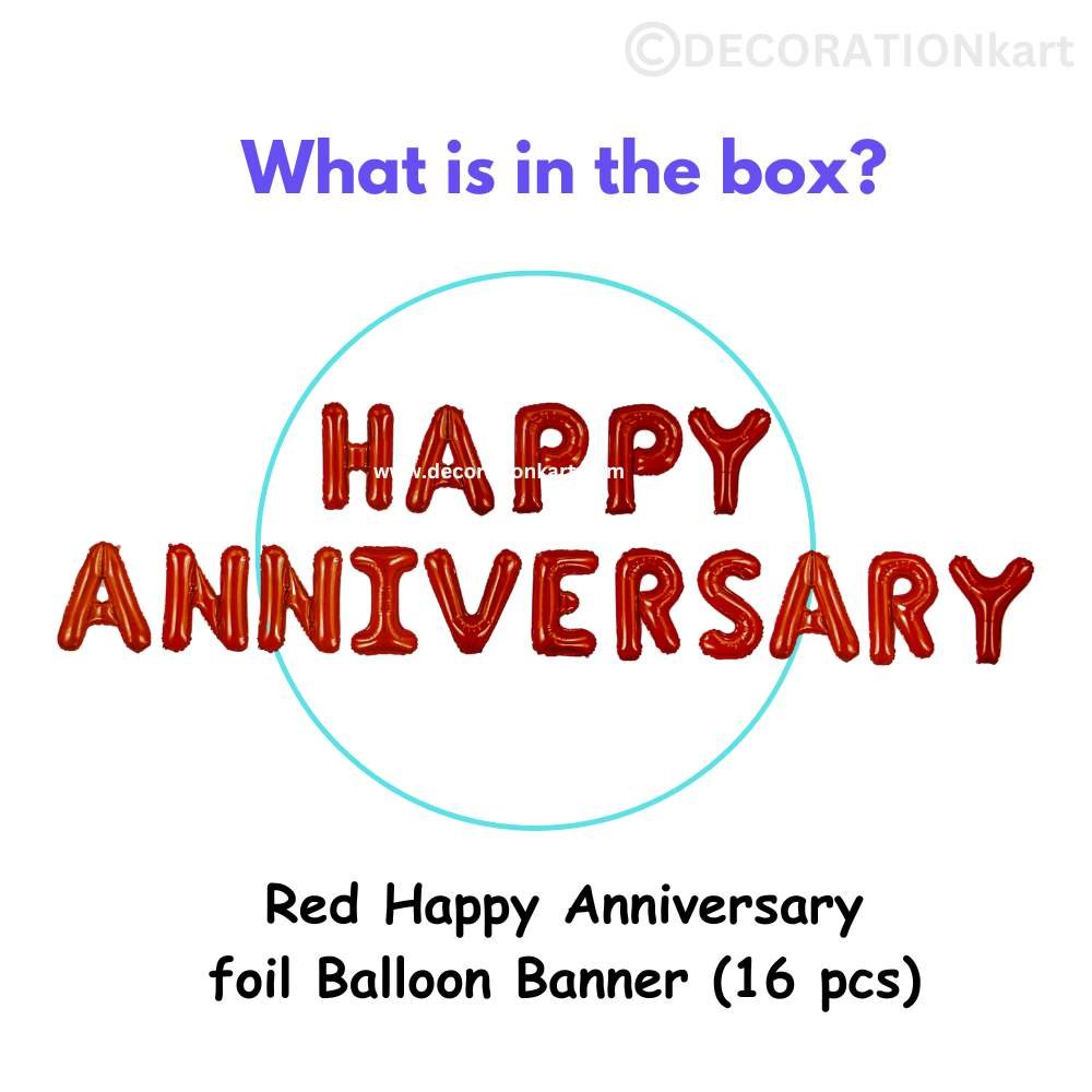 - Anniversaries are milestones of love, and décor plays a huge role in making them memorable. DECORATIONkart HAPPY ANNIVERSARY Red Foil Balloons are designed to add romance and elegance to your celebration. Crafted with premium quality foil and finished in a bold metallic red shine, this balloon set spells out “HAPPY ANNIVERSARY” in striking letters. Whether it’s a private dinner, a grand party, or a surprise setup, these balloons instantly create a festive and romantic backdrop.