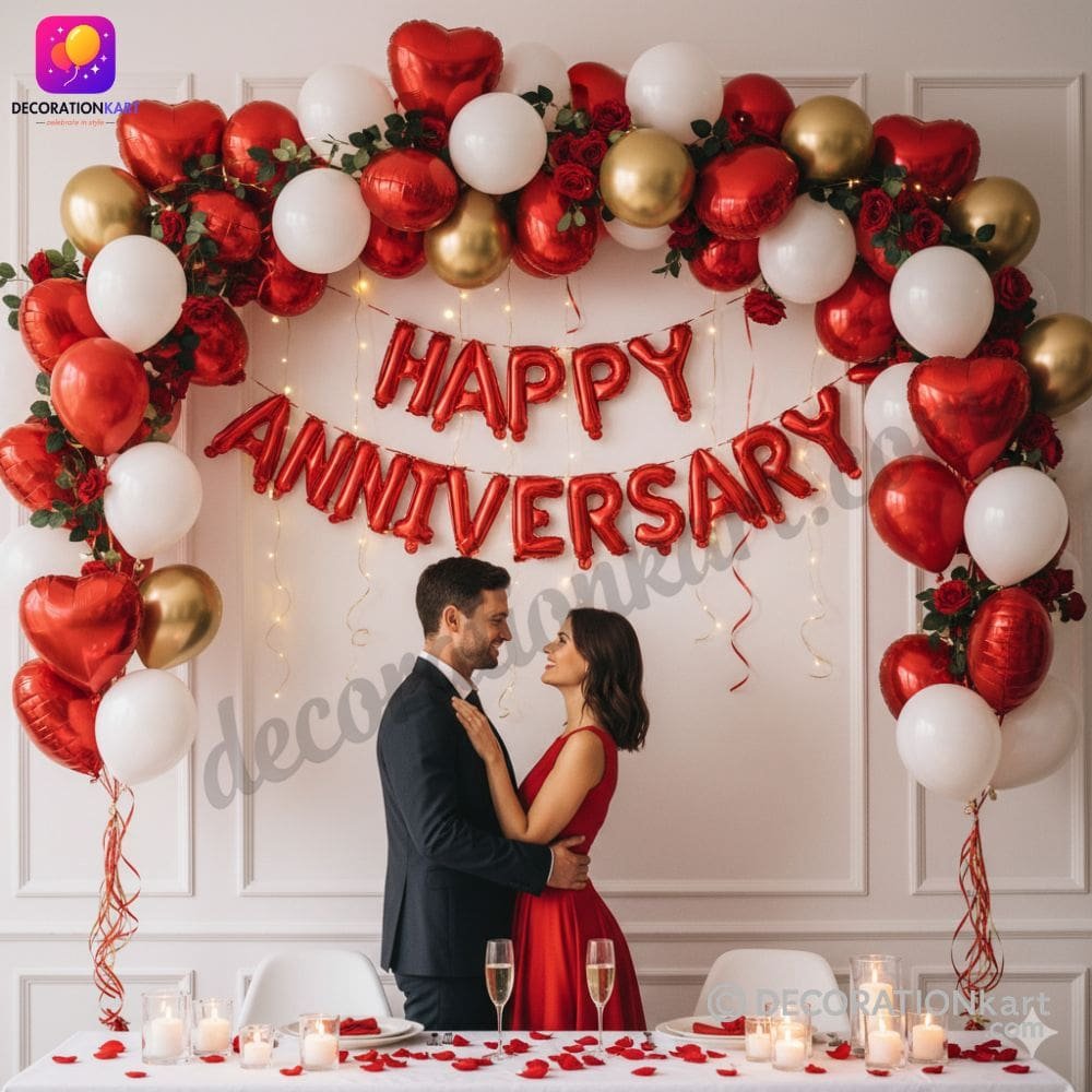 - Planning an anniversary surprise can be stressful, but with DECORATIONkart, you get décor that is both stylish and easy to set up. These balloons can be arranged in multiple ways—hung on walls, tied with ribbons, or combined with fairy lights, rose petals, and heart‑shaped balloons. They are also perfect for creating a photo booth corner where couples can capture Instagram‑worthy memories.