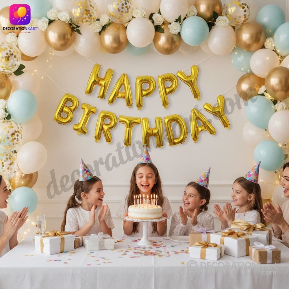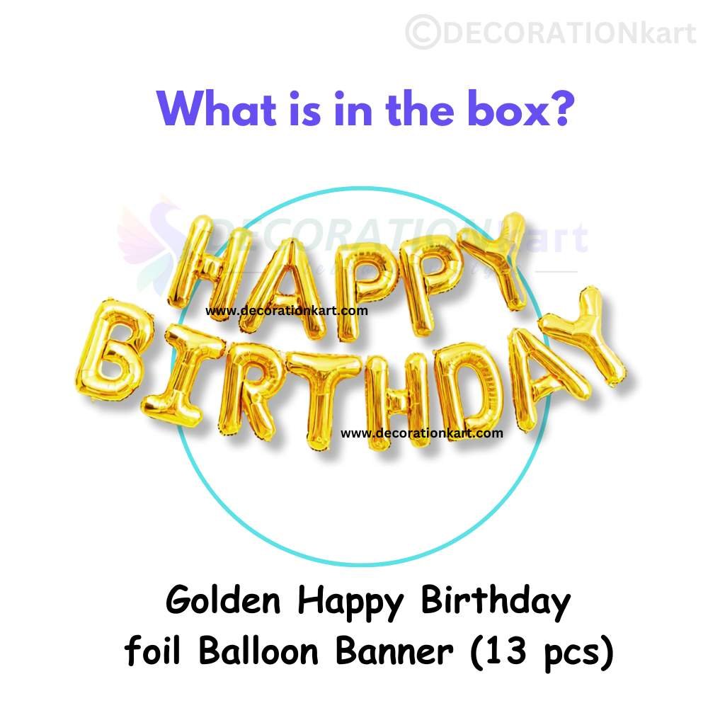 - Birthdays are milestones that deserve to be celebrated in style. DECORATIONkart HAPPY BIRTHDAY Golden Foil Balloons are designed to add sparkle, elegance, and joy to your party. Crafted with premium quality foil and finished in a rich metallic golden shine, this balloon set spells out “HAPPY BIRTHDAY” in bold, eye‑catching letters. Whether it’s a kids’ birthday, milestone celebration, or surprise party, these balloons create a glamorous and festive backdrop.
