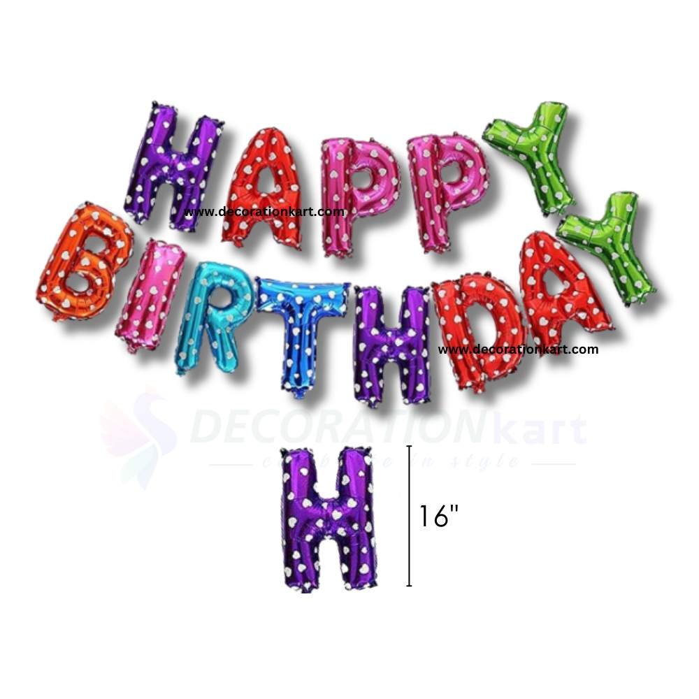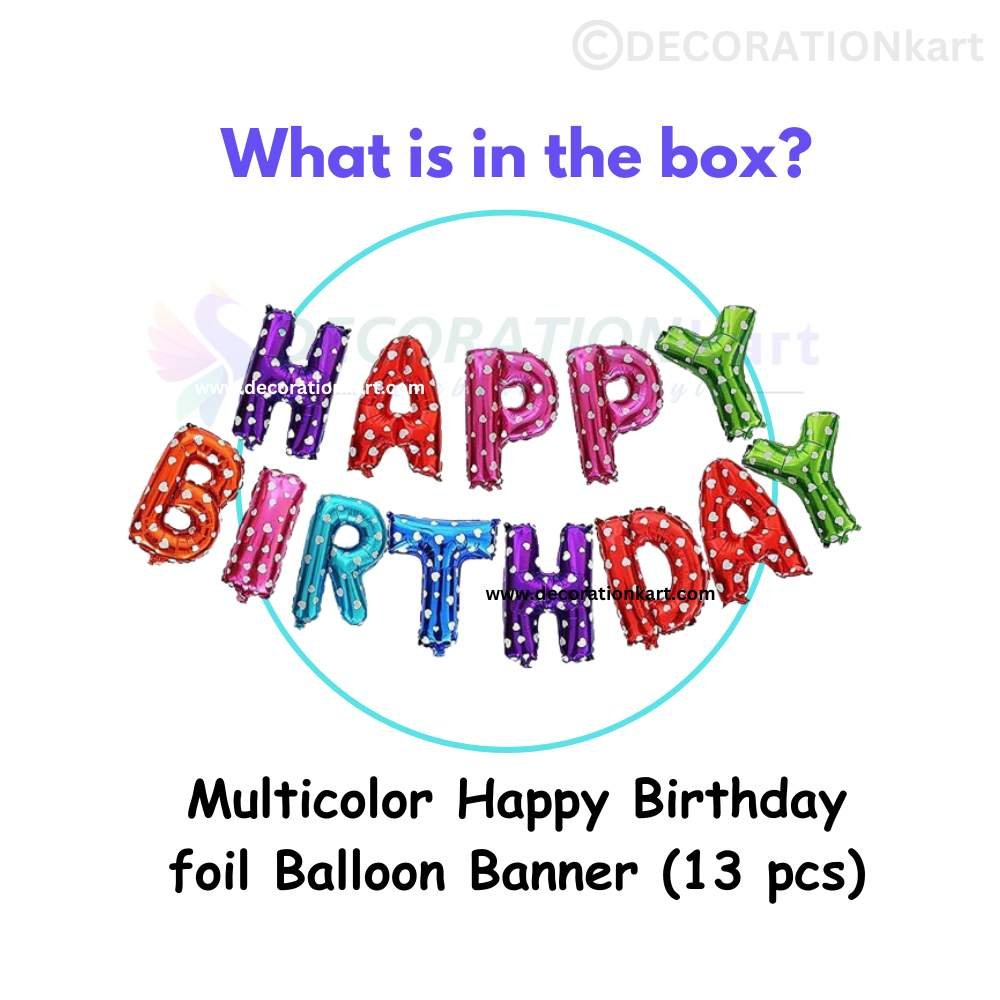 - Birthdays are meant to be colorful, joyful, and unforgettable. DECORATIONkart HAPPY BIRTHDAY Multicolor Foil Balloons are designed to bring instant cheer and vibrancy to your celebration. Crafted with premium quality foil and finished in bright metallic multicolor shades, this balloon set spells out “HAPPY BIRTHDAY” in bold, eye‑catching letters. Whether it’s a kids’ birthday, milestone celebration, or surprise party, these balloons create a festive backdrop that everyone will love.