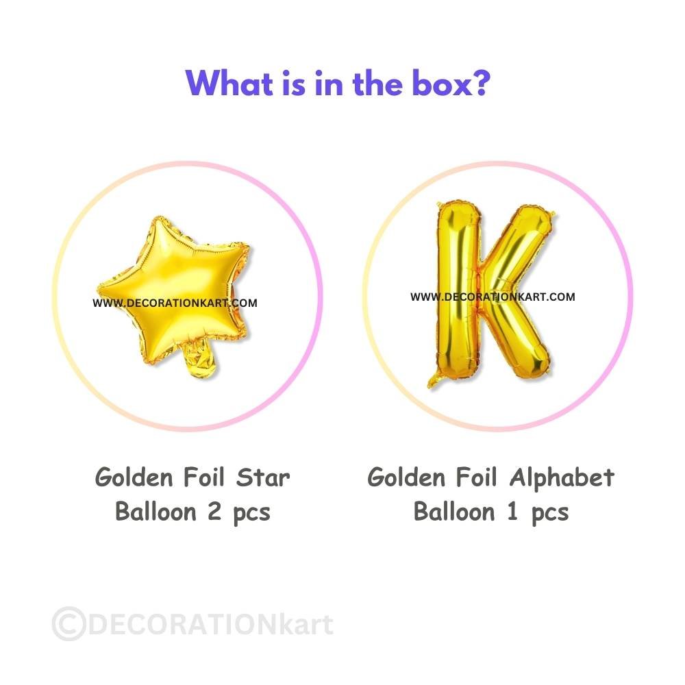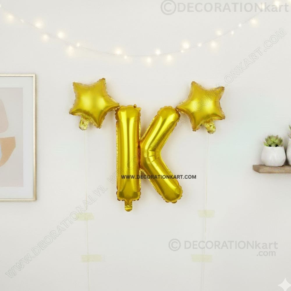 A stylish 3-piece balloon combo featuring one golden alphabet K (16 inch) and two golden stars (9 inch each) β€” perfect for adding sparkle to any celebration.