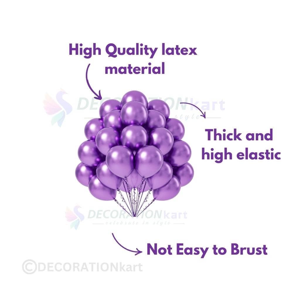 - PREMIUM PURPLE BALLOONS FOR DECORATION: Decorationkart brings 50 pcs, 100 pcs, 150 pcs of 12-inch chrome finish purple balloons for decoration, designed with high-quality latex to give a rich and elegant look. Perfect for balloons for birthday decoration, balloon arches, or balloon bunches, these metallic balloons add sophistication to any event. Use them as part of your balloon decoration kit to create a luxurious purple theme decoration.