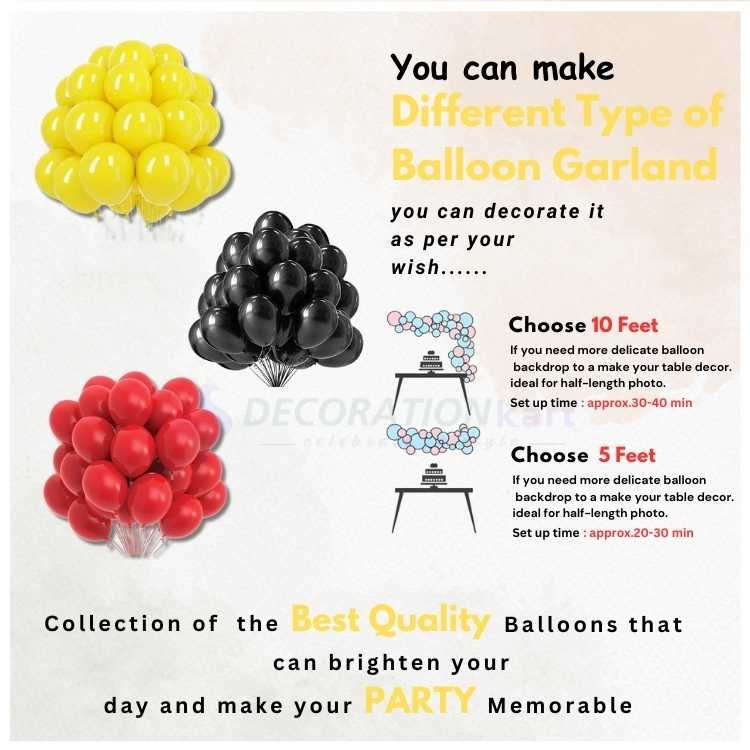 - The balloon selection adds vibrancy and emotional warmth to your setup. With 45 metallic balloons in a lively trio of 15 Golden, 15 Yellow, and 15 Red, this palette evokes joy, positivity, and love. Golden balloons bring elegance and shine, yellow balloons add brightness and cheer, and red balloons symbolize affection and celebration. Whether you're crafting balloon garlands, clusters, or ceiling drops, this trio ensures your décor feels cohesive, festive, and full of life.