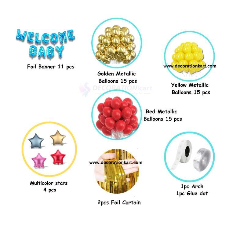 - Celebrate the arrival of your little star with vibrant charm and heartfelt warmth using the DECORATIONkart 64 Pcs Welcome Baby Party Decoration DIY Kit. Thoughtfully designed to create a joyful and picture-perfect atmosphere, this combo is ideal for baby showers, welcome baby events, or gender reveal parties. Whether you're decorating a cozy living room, a banquet hall, or an outdoor garden, this kit brings together premium materials, cheerful colors, and effortless DIY convenience.