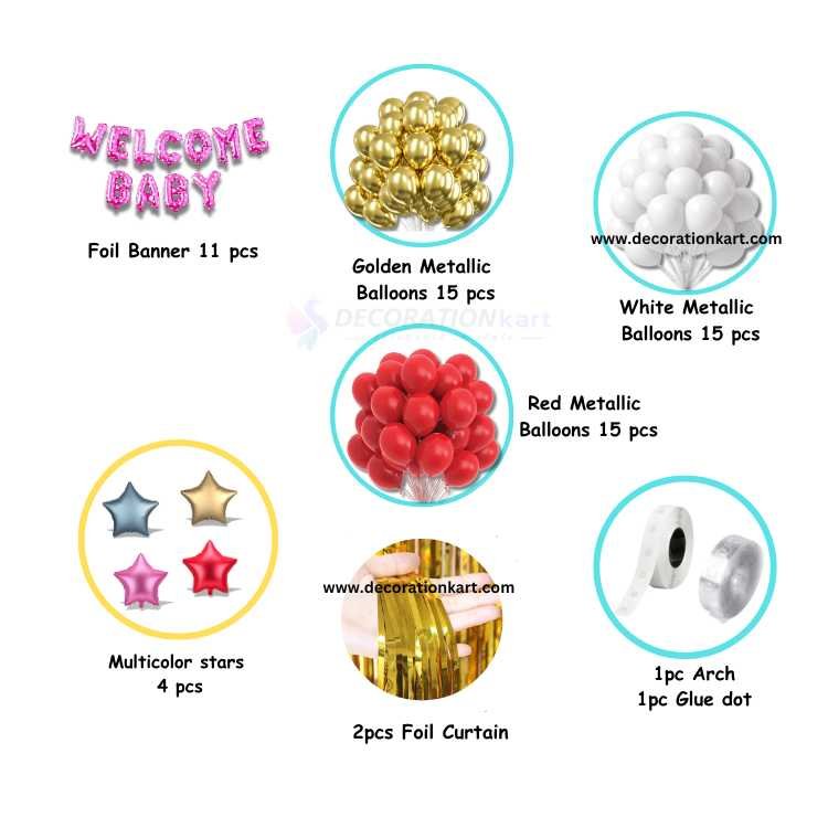 - Every baby brings a new chapter of joy, and the DECORATIONkart 64 Pcs Welcome Baby Party Decoration DIY Kit is designed to celebrate that moment with elegance and heart. This isn’t just a decoration set — it’s a mood, a memory-maker, and a visual love letter to your little one’s arrival.