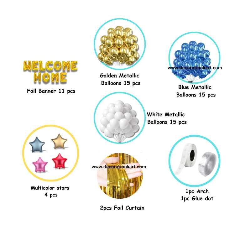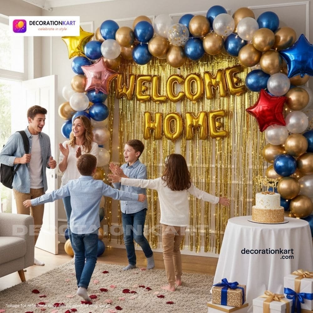 • A homecoming is more than a return—it’s a reunion of hearts, a celebration of presence, and a moment that deserves to be beautifully marked. The DECORATIONkart 60 Pcs WELCOME HOME Party Decoration DIY Kit is crafted to turn any space into a warm, inviting, and joy-filled welcome zone. Whether you're greeting a loved one after a long journey, celebrating a baby’s arrival, or hosting a surprise reception, this kit brings together elegance, emotion, and effortless styling.