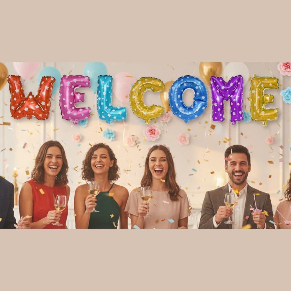 • 7 × Multicolor Foil Balloons (Letters: W E L C O M E)