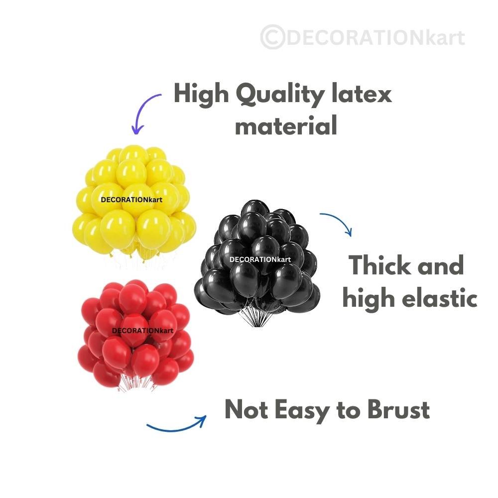 | Included Components | 50pcs Yellow, 50pcs Red, 50pcs Black Metallic Balloons (12 inch) |