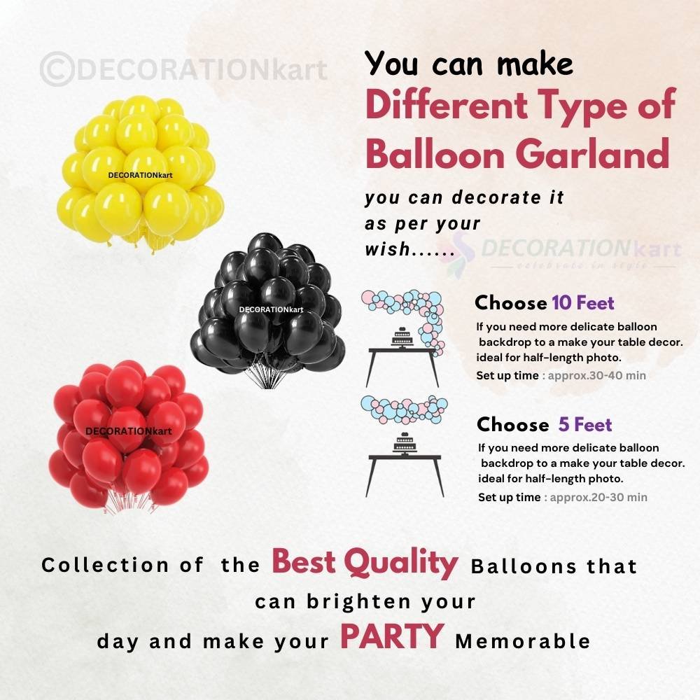 This striking combo of 150 balloons โ 50 yellow, 50 red, and 50 black โ adds drama and energy to any celebration. Perfect for birthdays, themed parties, or festive events, these balloons help you build bold garlands, eye-catching backdrops, and stylish table setups. - PREMIUM LATEX FOR DURABILITY & SAFETY: