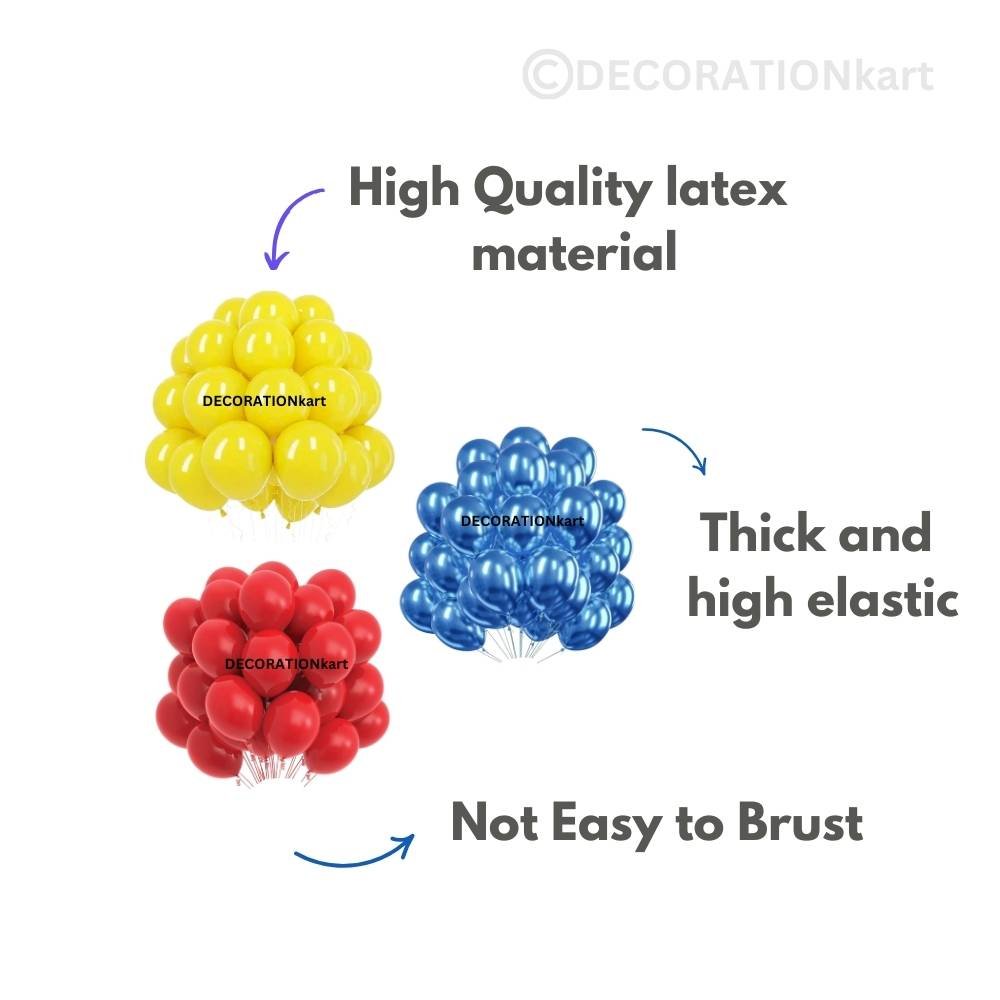 | Included Components | 50pcs Yellow, 50pcs Red, 50pcs Blue Metallic Balloons (12 inch) |